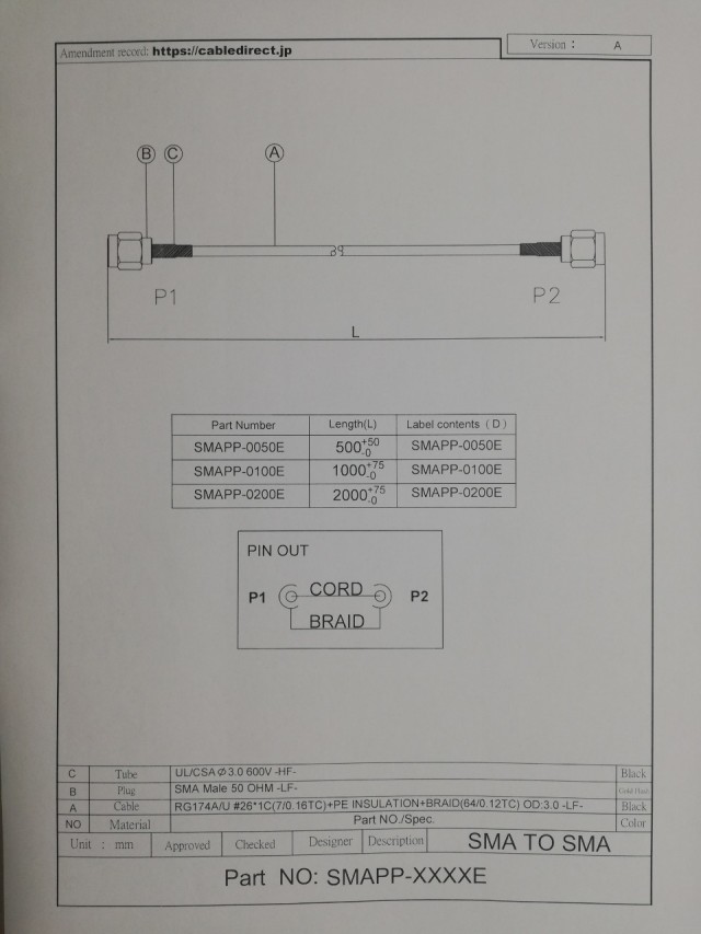 ●細径(直径3.0)でインピーダンス50オームのRG-174/U(MIL-C-17F規格)同軸ケーブル(1.5D-2V相当)を使用しています。